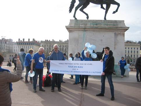 Le 3 avril 2018, regroupement place Bellecour à Lyon, de personnes habillées en bleu. Distribution de ballons et bulles de savon bleus pour attirer les passants et les sensibiliser à l’autisme, puis déambulation jusqu’au palais de justice éclairé en bleu, couleur de l’autisme.